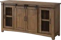 The Odessa Crossing console is a gorgeous rustic style TV Stand. Features the lightning fast assembly system: Easy, quick, and tool less assembly process allows for the TV stand to be assembled in 10 minutes or less. Same strength and rigidity as traditional assembly method. Constructed of solid pine with pine veneer back panel that offers just the right amount of distressing that can blend easily with other farmhouse, rustic, coastal, warehouse, or loft looks. The two side doors feature a metal mesh style look that adds to the rustic and distressed look. Four total interior shelves are removable and adjustable providing versatile storage options for audio, video, gaming components. Cable management cutouts are conveniently provided for the main cabinet and outer cabinets. Ideal for most 65" flat panel TVs and up to 70". Customer assembly required.