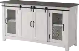 The Odessa Crossing console is a gorgeous rustic style TV Stand. Features the lightning fast assembly system: Easy, quick, and tool less assembly process allows for the TV stand to be assembled in 10 minutes or less. Same strength and rigidity as traditional assembly method. Constructed of solid pine with pine veneer back panel that offers just the right amount of distressing that can blend easily with other farmhouse, rustic, coastal, warehouse, or loft looks. The two side doors feature a metal mesh style look that adds to the rustic and distressed look. Four total interior shelves are removable and adjustable providing versatile storage options for audio, video, gaming components. Cable management cutouts are conveniently provided for the main cabinet and outer cabinets. Ideal for most 65" flat panel TVs and up to 70". Customer assembly required.