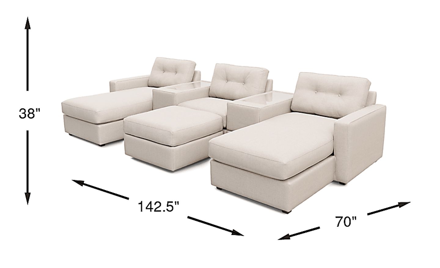 This configuration is optimized for both relaxation and organization. It includes two integrated consoles, providing dedicated space for drinks and remotes to keep your surfaces clear. Additionally, the set features a storage ottoman, an essential for urban apartment living or cozy family rooms where you need a discreet place to stow away blankets, pillows, or media accessories.