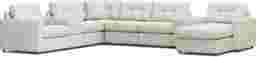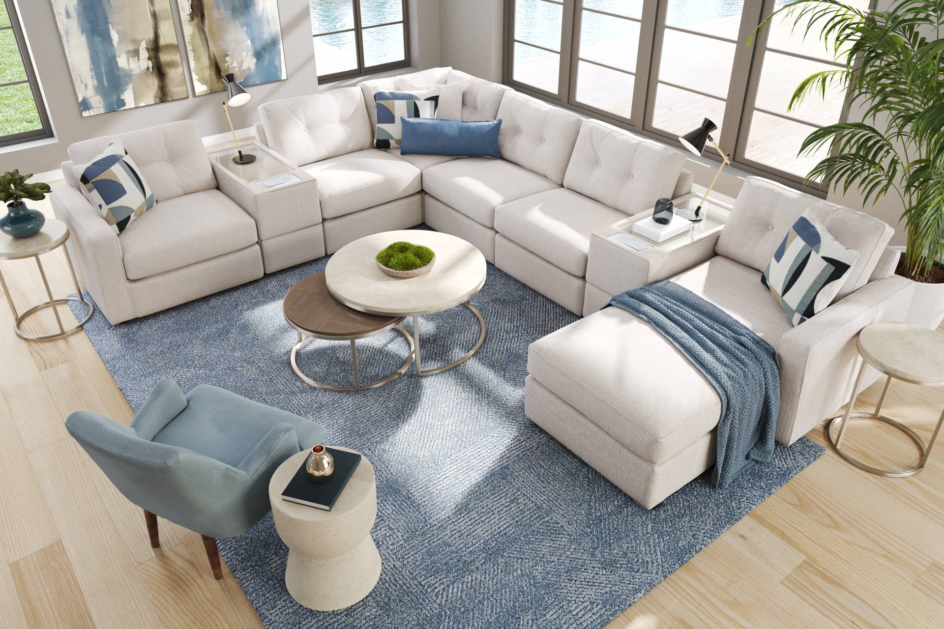 Discover the limitless possibilities of the Drew & Jonathan ModularOne, thoughtfully designed with comfort and flexibility in mind. This customizable seating solution features individual pieces that can be configured to any shape your room needs - the seating arrangement you want is always right at your fingertips. Each individual piece is upholstered on all sides in handsome off-white textured fabric. The seating area has welted track arms, top-stitched seat cushions and button-tufted back cushions for an elegant silhouette. Two media consoles provide hidden storage, USB charging ports, wireless charging, bluetooth-enabled speakers, and double as side tables with sleek acrylic tops. Includes RAF chaise, 2 media consoles, 3 armless chairs, wedge, and LAF chair. Upholstery: 100% Polypropylene.