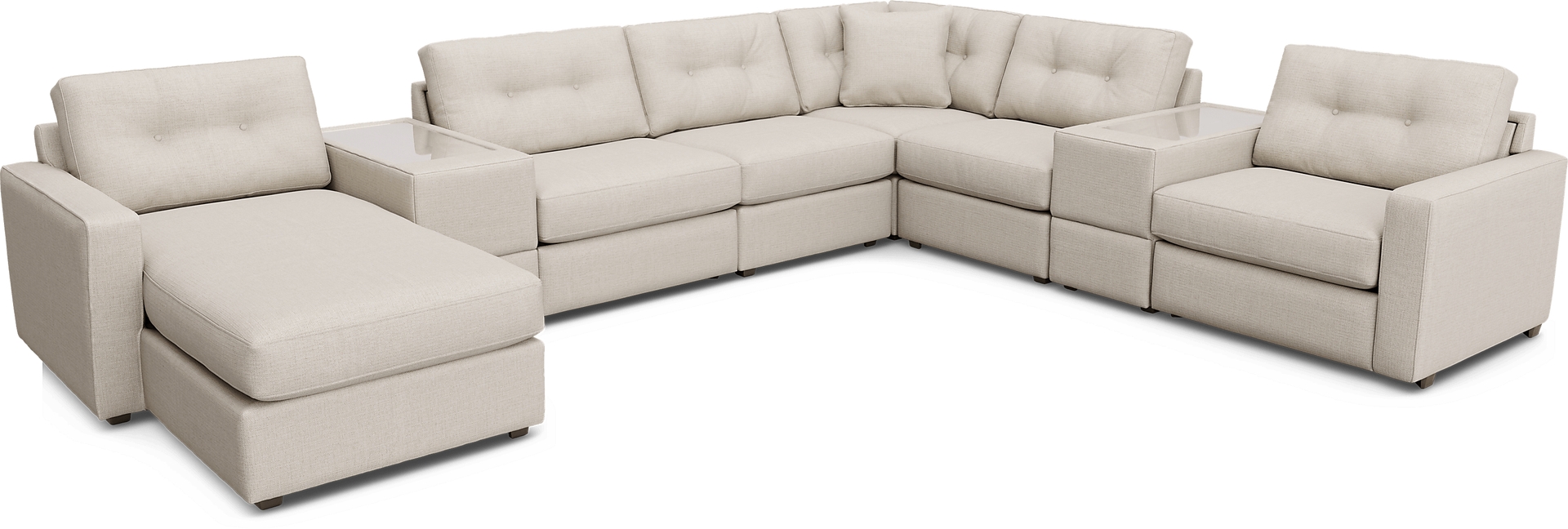 Discover the limitless possibilities of the Drew & Jonathan ModularOne, thoughtfully designed with comfort and flexibility in mind. This customizable seating solution features individual pieces that can be configured to any shape your room needs - the seating arrangement you want is always right at your fingertips. Each individual piece is upholstered on all sides in handsome off-white textured fabric. The seating area has welted track arms, top-stitched seat cushions and button-tufted back cushions for an elegant silhouette. Includes LAF chaise, 2 consoles, 3 armless chairs, wedge, and RAF chair. Upholstery: 100% Polypropylene.