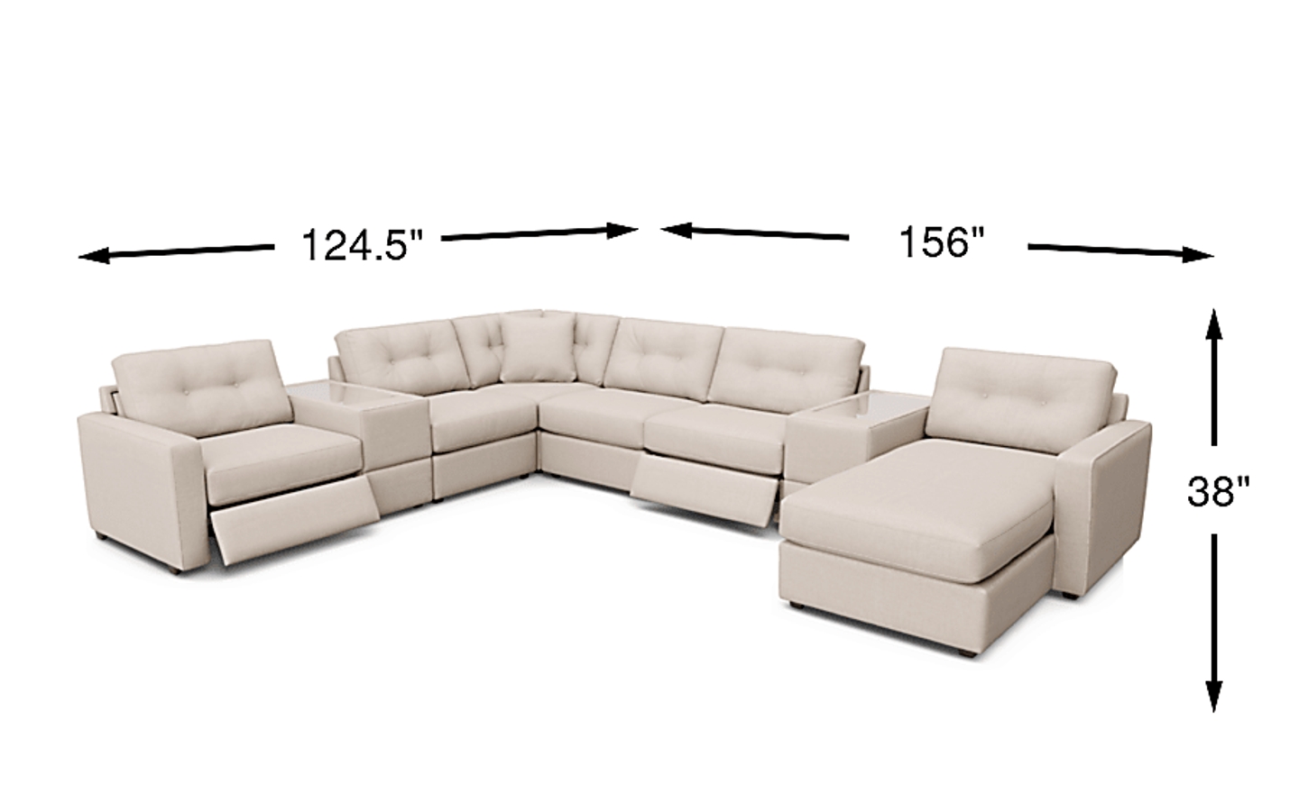 Discover the limitless possibilities of the Drew & Jonathan ModularOne, thoughtfully designed with comfort and flexibility in mind. This customizable seating solution features individual pieces that can be configured to any shape your room needs - the seating arrangement you want is always right at your fingertips. Each individual piece is upholstered on all sides in handsome off-white textured fabric. The seating area has welted track arms, top-stitched seat cushions and button-tufted back cushions for an elegant silhouette. Seats with power reclining functionality allow for easy adjustment of the footrest, providing the ultimate in personalized comfort. Includes RAF chaise, 2 consoles, armless power recliner, 2 armless chairs, wedge, and LAF power recliner. Upholstery: 100% Polypropylene.
