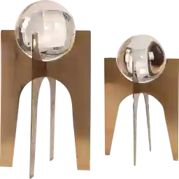These sculptures are built using high-quality materials selected for both aesthetics and stability. They feature premium crystal spheres for a clear, light-refracting look, supported by durable stainless steel bases. The metal is finished in a brushed, plated copper bronze, providing a sophisticated gold-toned luster that complements modern and transitional interiors.