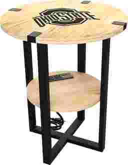 The Ohio laser etched round side table features a modern design that seamlessly blends with various decorative styles. It offers a convenient functionality for charging up to four devices at one time. The 2-Tier shelf also provides ample space to store your TV remote and other small items. Whether you are a Buckeyes fan or simply appreciate well-crafted furniture, this side table is a versatile addition to any room. Customer assembly is required.