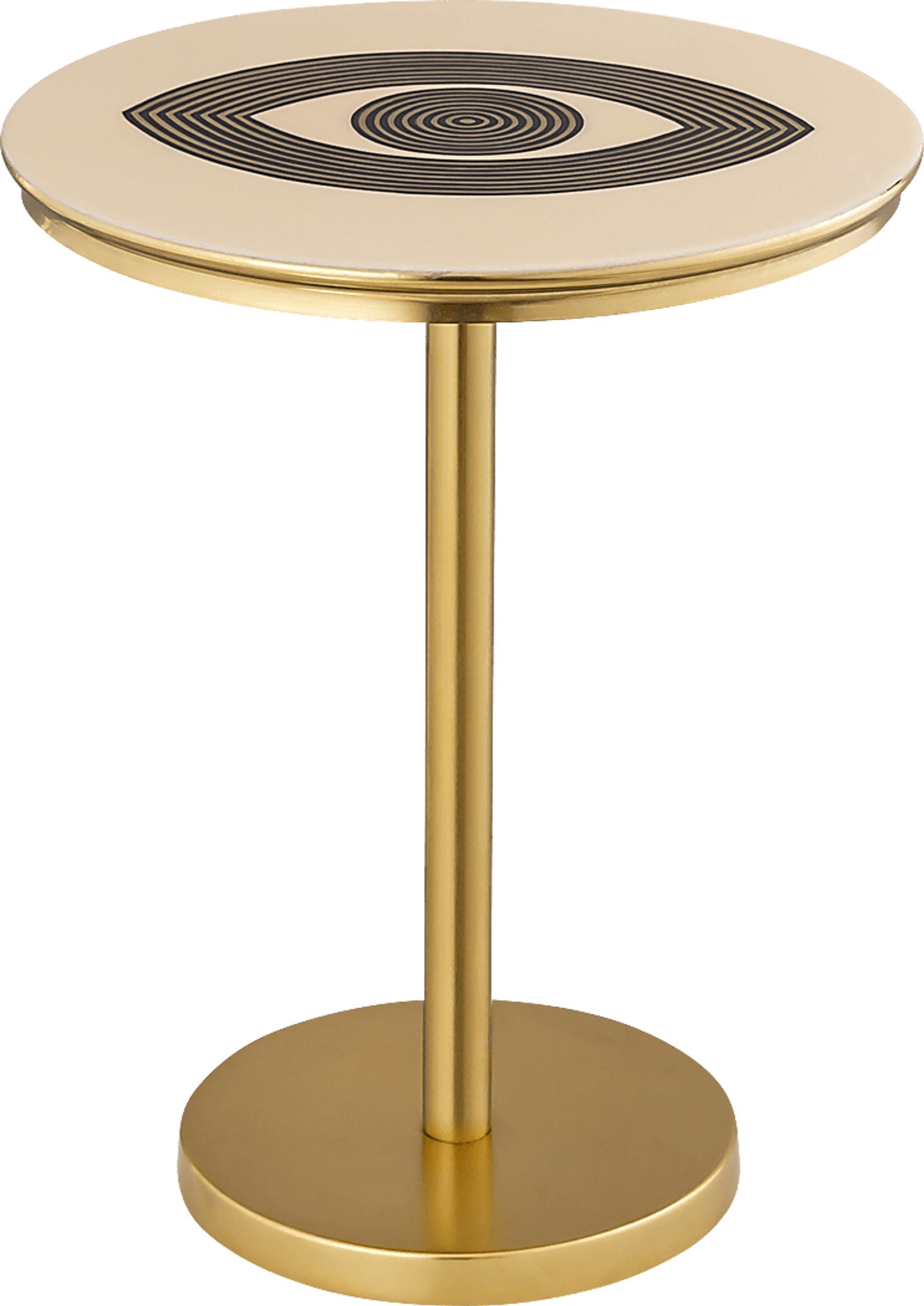 Boasting a minimalist design and hand painted finish, this brass colored Ojoel accent table was made to suit most any decor. Used solo or in pairs, it's guaranteed to be an eye-catcher. Customer assembly is required.