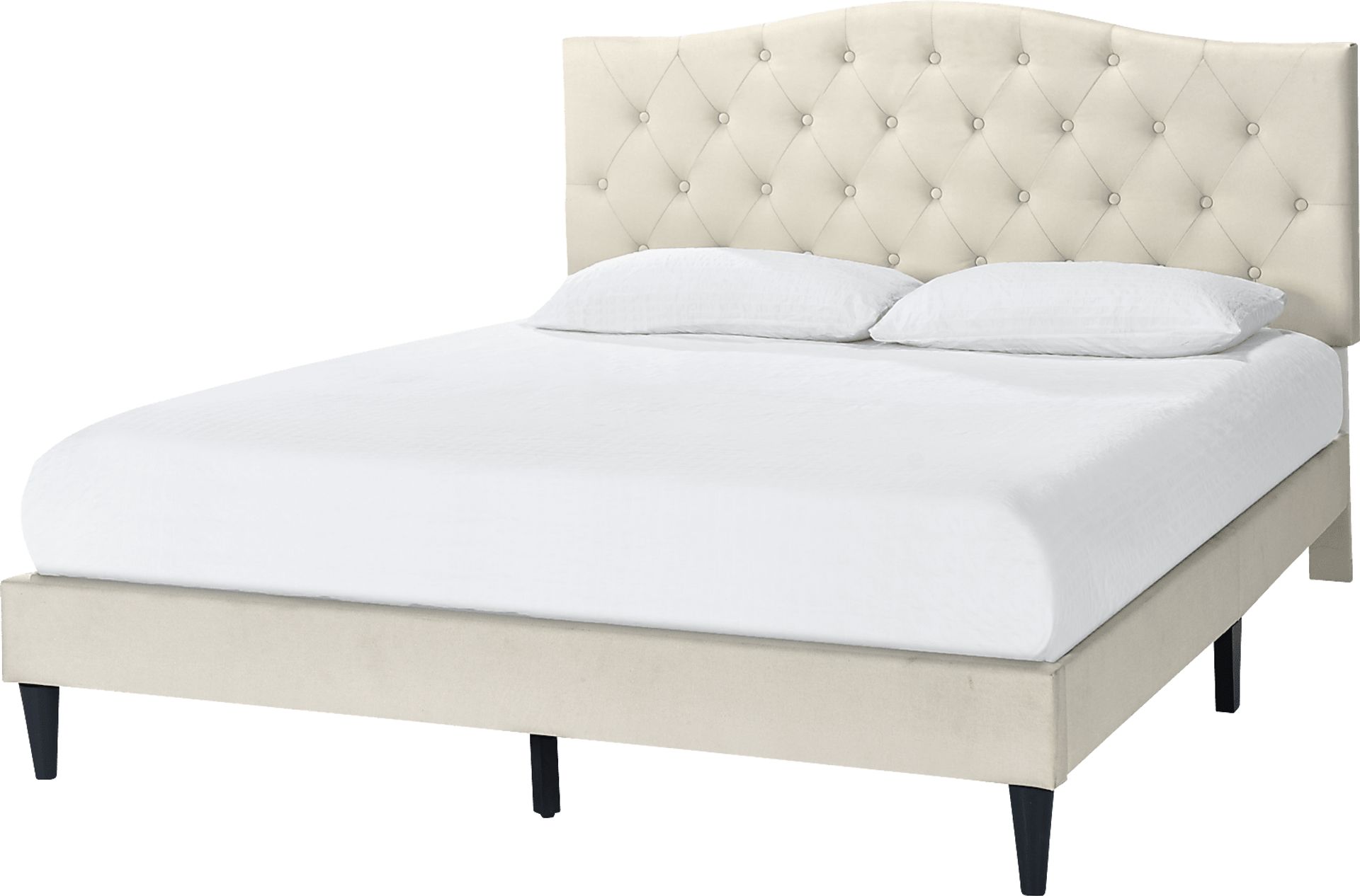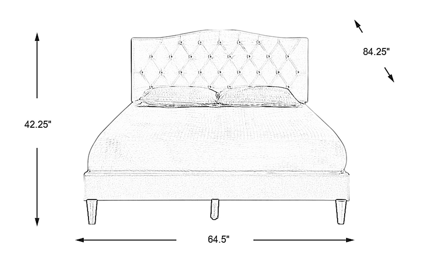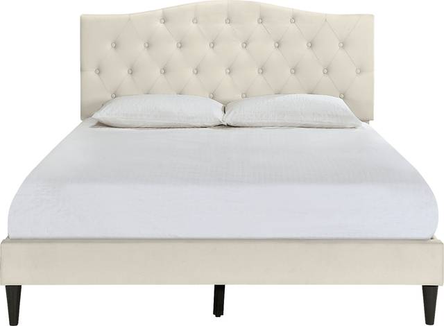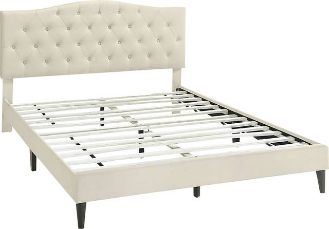 A beautiful camelback peak features diamond button tufting on the plush headboard of this Oldenburg platform bed, creating a feminine appeal. The low-profile design doesn't overpower, while the beige, linen-look upholstery adds warmth with a casual feel. Matching side rails and cylinder tapered legs complete the look. Platform style bed, foundation not required. Mattress is sold separately. Customer assembly is required.