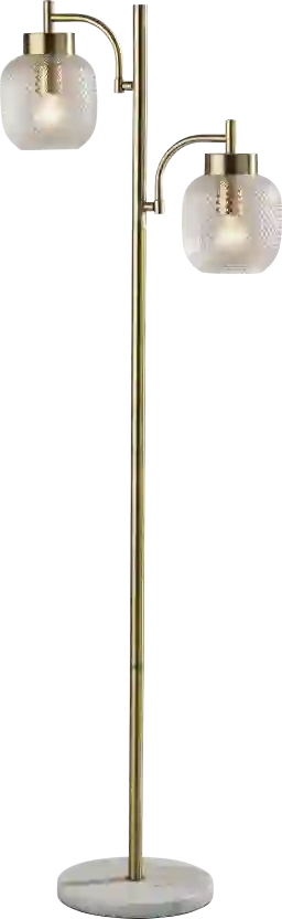 With a skillful blend of antique brass finish, marble, and textured glass, the Oley Loop floor lamp elevates your bedroom, living area, or office with contemporary style. The humble design combines a round white marble base with a slender pole and gracefully arching stems. Set at offset heights and directions, the dual stems support clear textured glass shades that bring warmth to your room by softly diffusing the light from 60W bulbs. With a discreet touch switch located on each shade, it is easy to turn the lamp on or off with the touch of a finger. Partial assembly may be required.