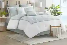 This set provides a coordinated top-of-bed look in one package. It includes the oversized comforter, two matching shams featuring the seafoam blue embroidered accents, and one coordinating bed skirt. This ensures a cohesive coastal aesthetic from the top of the pillows down to the floor.