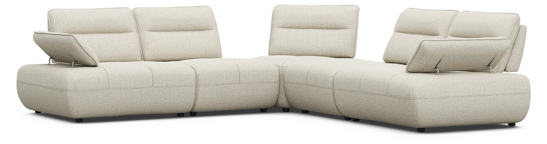 Distinctive design and adjustable comfort blend harmoniously in the Olympia sectional, creating a living space that never loses its exciting look and feel. Linen-colored chenille hugs stunning curves from the base to the tufted seat cushions and the top of each wedge-shaped back cushion. Seat backs feature individually adjustable depth for the perfect comfort setting. The height of each arm can also be adjusted to positions ideal for leaning or even laying down. Upholstery: 100% Polyester.