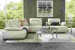 Distinctive design and adjustable comfort blend harmoniously in the Olympia sectional, creating a living space that never loses its exciting look and feel. Linen-colored chenille hugs stunning curves from the base to the tufted seat cushions and the top of each wedge-shaped back cushion. Seat backs feature individually adjustable depth for the perfect comfort setting. The height of each arm can also be adjusted to positions ideal for leaning or even laying down. Bringing another layer of luxury, the console in this configuration includes a bluetooth-enabled sound system and USB charging ports set into a white top with a marble pattern. Upholstery: 100% Polyester.