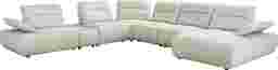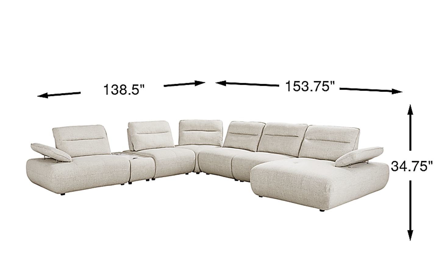 Distinctive design and adjustable comfort blend harmoniously in the Olympia sectional, creating a living space that never loses its exciting look and feel. Linen-colored chenille hugs stunning curves from the base to the tufted seat cushions and the top of each wedge-shaped back cushion. Seat backs feature individually adjustable depth for the perfect comfort setting. The height of each arm can also be adjusted to positions ideal for leaning or even laying down. Bringing another layer of luxury, the console in this configuration includes a bluetooth-enabled sound system and USB charging ports set into a white top with a marble pattern. Upholstery: 100% Polyester.