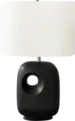 Illuminate your space with the modern and trendy Omaha Reef Black Lamp with a sleek black ceramic base and topped with a linen-blend, ivory fabric shade. The architectural and contemporary cut-out design on this lighting piece will easily brighten and elevate your home decor whether placed on an end or side table, or on a nightstand as a chic decorative and functional accent. Partial assembly may be required.