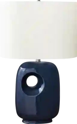 Illuminate your space with the modern and trendy Omaha Reef Navy Lamp with a sleek dark blue ceramic base and topped with a linen-blend, ivory fabric shade. The architectural and contemporary cut-out design on this lighting piece will easily brighten and elevate your home decor whether placed on an end or side table, or on a nightstand as a chic decorative and functional accent. Partial assembly may be required.