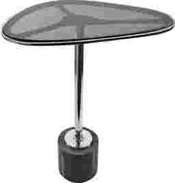 The Omollo is a sleek & modern elegant marble base and glass top end table. Elevate your living space with this sophisticated blend of modern design and timeless materials. Featuring a dark-tinted glass top with a sleek silver metal border, this table brings a polished, contemporary touch to any room. The rounded triangular shape of the glass top adds a unique and eye-catching element, while the metal frame supports the table with clean, elegant lines. The striking contrast of the black marble base provides a luxurious grounding to this modern accent table, offering both stability and style. Whether placed beside your sofa, in your entryway, or as a chic side table, this piece effortlessly complements both minimalist and more traditional interiors with its versatile design and refined aesthetic. Perfect for showcasing decorative accents, serving as a functional side table, or adding a touch of sophistication to your home, this glass and marble table is sure to become a focal point in