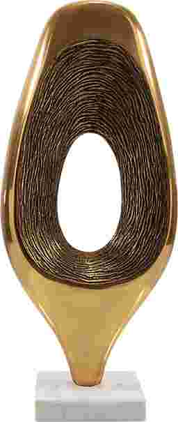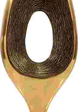 This sculpture can serve as an "anchor" by creating a strong visual focal point that draws the eye. Its abstract "thumb" shape and the interplay of solid gold and open space provide a unique silhouette that breaks up the flat planes of a room. By placing it on a coffee table or sideboard, you create an intentional design zone. For maximum impact, follow the interior design principle of grouping items in odd numbers; place the sculpture alongside a shorter ceramic bowl or a stack of books to create a balanced, curated display.