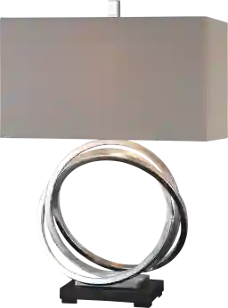 The Orbital table lamp has sleek iron rings finished in metallic silver leaf accents and a rustic bronze footed base creates an eternal elegance for your home. The rectangle hardback shade is a light beige linen fabric. Customer assembly required.