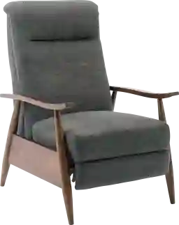 A clean classic recliner is what you get with the Orcut wood arm push back chair. Featuring chestnut brown wood arms with tapered legs this comfortable recliner adds a modern look to any room. The stylish charcoal fabric is easy to care for and blends well with most decors. Customer assembly is required.
