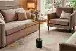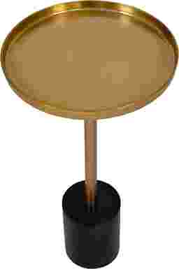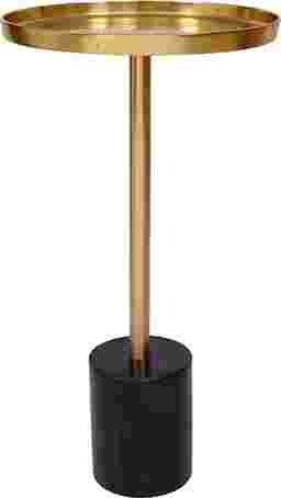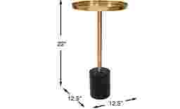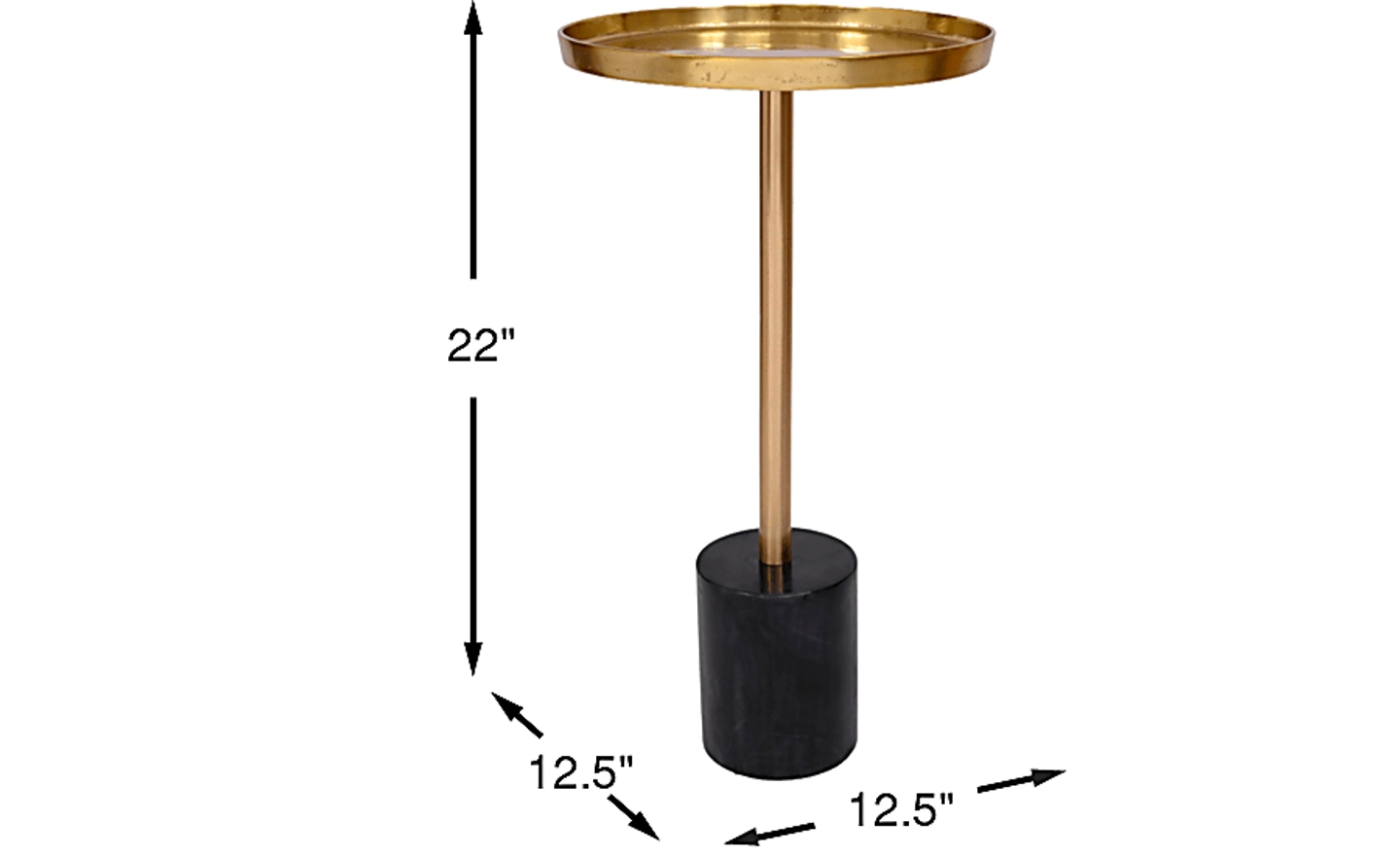 Glowing with the golden romance of an old-world atelier, the Orelia accent table brings chic elegance as the perfect companion beside a sofa, chair or bedside. Contemporary in style, this piece features a round golden tray top that offers a polished perch for a drink, candle, or small book, while the slender stem creates a light, airy profile. A bold black cylindrical marble base anchors the accent, making the design feel both grounded and sophisticated.
