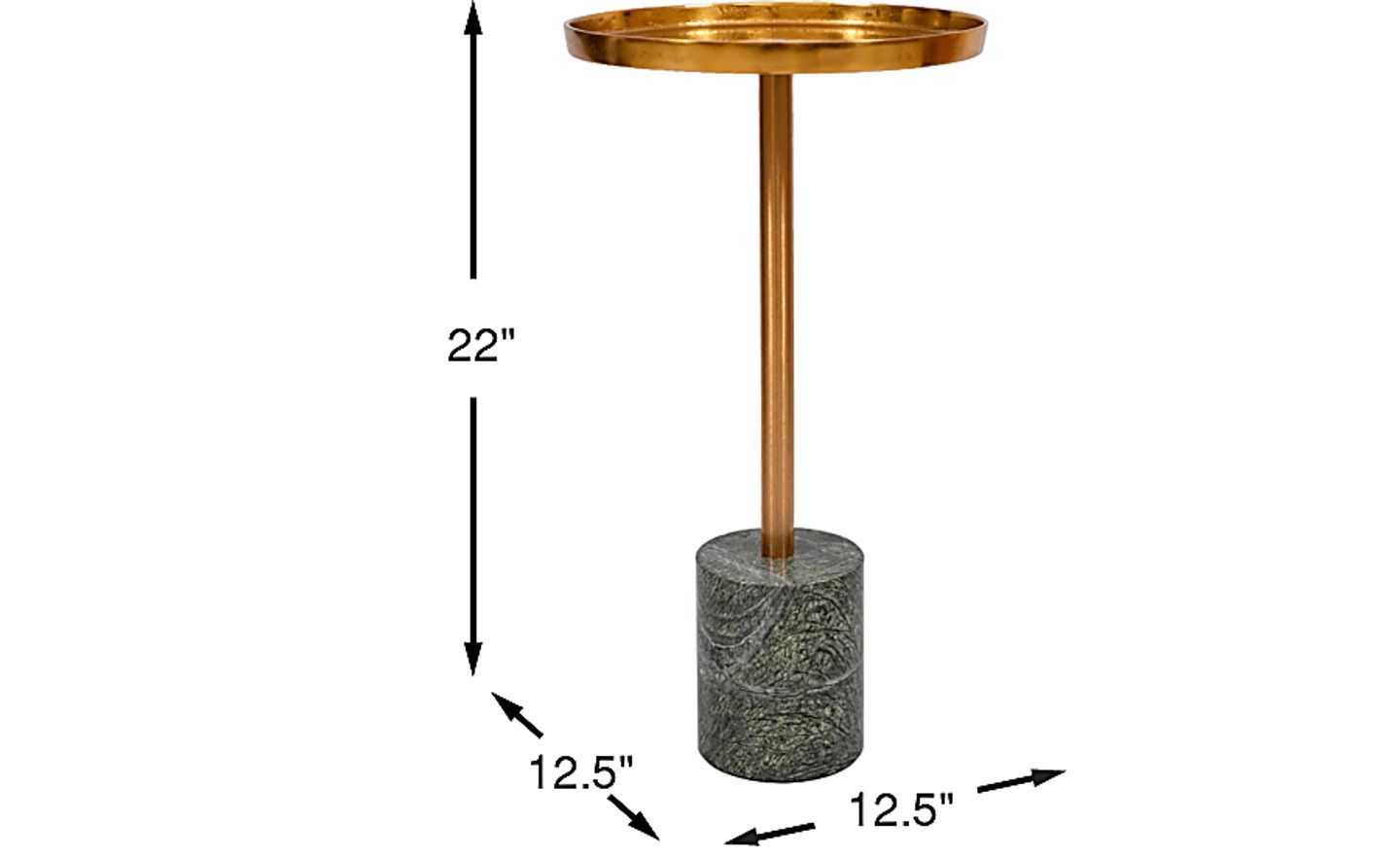 Glowing with the golden romance of an old-world atelier, the Orelia accent table brings chic elegance as the perfect companion beside a sofa, chair or bedside. Contemporary in style, this piece features a round golden tray top that offers a polished perch for a drink, candle, or small book, while the slender stem creates a light, airy profile. A dark green cylindrical marble base anchors the accent, making the design feel both grounded and sophisticated.