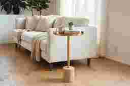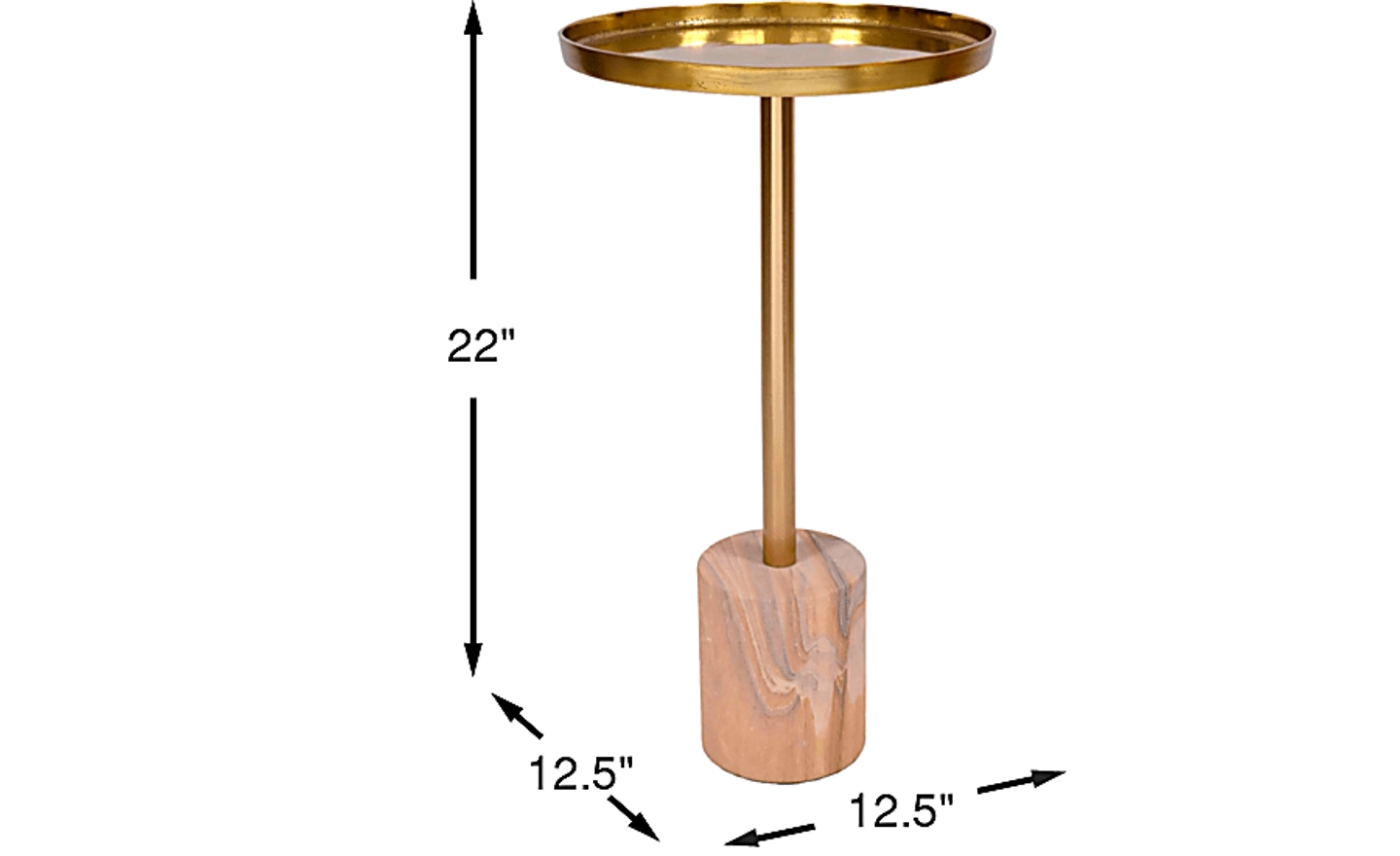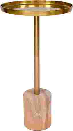 Glowing with the golden romance of an old-world atelier, the Orelia accent table brings chic elegance as the perfect companion beside a sofa, chair or bedside. Contemporary in style, this piece features a round golden tray top that offers a polished perch for a drink, candle, or small book, while the slender stem creates a light, airy profile. A sandy brown cylindrical marble base anchors the accent, making the design feel both grounded and sophisticated.