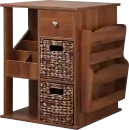 Say goodbye to clutter with the must-have Orinia Rotating End Table, designed to keep everything you need right at your fingertips. This unique and clever storage solution features a matching wood drawer with a brushed nickel knob, along with two coordinating poly rattan drawers for concealed storage. Keep your eyeglasses, remote controls, tablets, smartphones, calculators, TV guides, and more within easy reach in a partitioned section. Store CDs, DVDs, or other items on the shelf underneath. The out-of-sight rotating mechanism allows for easy access to all four sides. Perfect for any room, this table arrives fully assembled for your convenience.