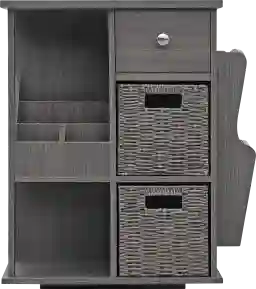 Say goodbye to clutter with the must-have Orinia Rotating End Table, designed to keep everything you need right at your fingertips. This unique and clever storage solution features a matching wood drawer with a brushed nickel knob, along with two coordinating poly rattan drawers for concealed storage. Keep your eyeglasses, remote controls, tablets, smartphones, calculators, TV guides, and more within easy reach in a partitioned section. Store CDs, DVDs, or other items on the shelf underneath. The out-of-sight rotating mechanism allows for easy access to all four sides. Perfect for any room, this table arrives fully assembled for your convenience.