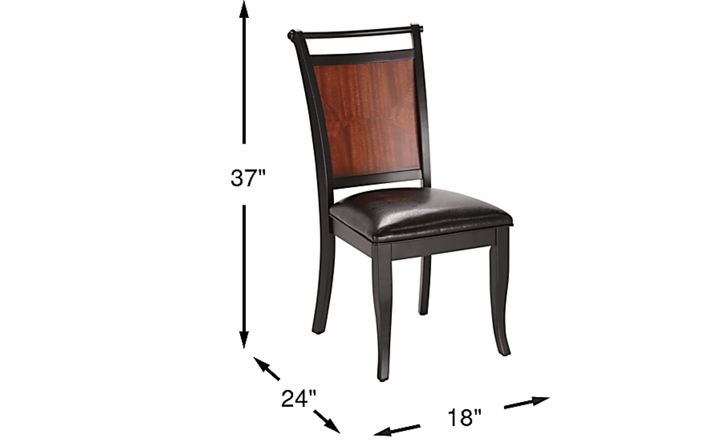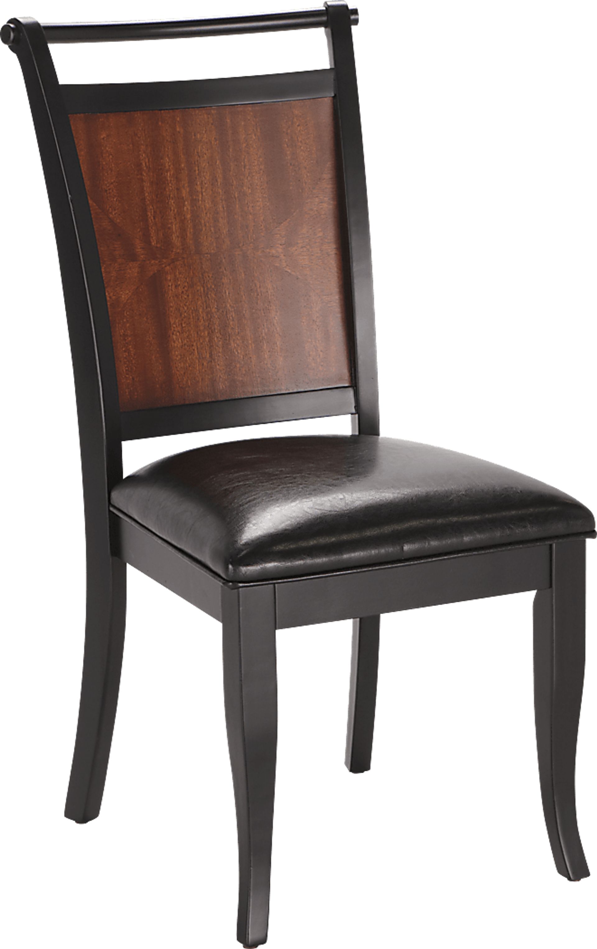 The Orland Park side chair is a stylish place to perch while enjoying meals. Attractive from any angle the chair features a beautiful two tone cherry and black finish. Patterned veneers add eye catching detail to the back while the black padded UltraHyde seat provides comfort. Tapered legs lend support.