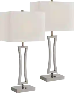 Bring modern design into your home decor with the Orleanox two piece set of 28" contemporary table lamps with USB port. This pair of sleek modern table lamps in brushed nickel finish features an eye-catching geometric look, with a curved, opened-up column sitting atop a modern base. The rectangular base includes a built-in 2A USB port, allowing you to fast charge smart phones or other electronic devices with ease. An off-white rectangular shade tops it off, and an on-off rocker switch located on base. Perfect on a bedside table for smart, functional lighting. Partial assembly may be required.