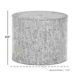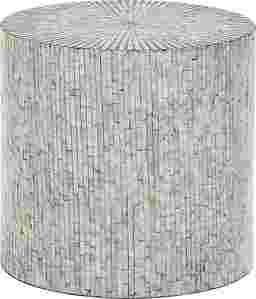 Embrace artistic expression with a style that highlights bold designs with sleek lines, neutral elements, and a minimalist aesthetic. The Ossen accent table is crafted from MDF as its core structure, while the overlay is entirely composed of mother of pearl. The cylinder table is adorned with a polished light blue and pearl white mosaic shell exterior, giving it an iridescent finish that catches the eye. As a mother of pearl accent table, it features a simple round form enhanced by vertical mussel shell mosaics, making it a striking statement piece in any contemporary setting. Customer assembly is required.