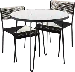Enjoy al fresco dining with the Chalmette black 3 Pc dining set. Serve drinks and appetizers from the white hexagon tile tabletop, while sitting comfortably on black and white woven chairs. Slide this set onto your screened-in porch for game time with friends, or station in your breakfast nook for a relaxing weekend meal. Center your outdoor entertaining around this stylish table and chairs for family fun in any season. Customer assembly is required.