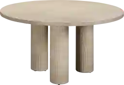 Introducing the outdoor Lawonna natural dining table, a stylish nod to Memphis design with its retro-cool vibes. The table features trendy ribbed pedestal legs and a travertine finish atop a durable concrete base, seamlessly blending vintage aesthetics with modern durability. Perfect for indoor or outdoor gatherings, this table combines sophisticated design with practical functionality for a chic and inviting dining experience. Customer assembly is required.