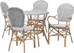 Recreate your own personal French-style bistro in your space with the expertly crafted outdoor Nalina Elle I black 5 Pc dining set. This set includes four dining chairs and one table constructed from natural rattan and wrapped in woven plastic. Each seat showcases a round backrest for smooth back support, while convenient armrests offer enhanced comfort. The Nalina Elle I will arrive fully assembled and features a round tabletop with plenty of elbow room for each member of the table. Presenting an enchanting ambiance for any occasion, the Nalina Elle I elevates every dining experience. Due to the nature of the natural materials used in this product, it may have variations in areas such as, but not limited to, color, pattern, grain and texture. The hair-like strands of rattan/rattan-fiber are common due to nature of the material.
