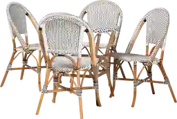 Capture the essence of a lovely French-style bistro in your space with the captivating design of the outdoor Nalina Elle II white 5 Pc dining set. This set includes four dining chairs and one table constructed from natural rattan and wrapped in woven plastic. Each seat has a round backrest for smooth back support, while the openwork design enables light to flow naturally throughout the room. The Nalina Elle II will arrive fully assembled and features a round tabletop with plenty of elbow room for each member of the table. Due to the nature of the natural materials used in this product, it may have variations in areas such as, but not limited to, color, pattern, grain and texture. The hair-like strands of rattan/rattan-fiber are common due to the nature of the material.