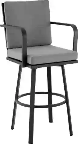 Enjoy an outdoor happy hour, entertain, or dine alfresco with the outdoor Owlmart I black and gray counter height stool. This armed counter stool is crafted from weather resistant materials that allow it to be used indoor or outdoor. The strong aluminum frame is resistant to rust, and its 360-degree swivel functionality allows for optimal mobility. The Owlmart I features a sturdy 4 leg base, and its ring footrest gives additional comfort for extended seating periods. The back and seat cushions are upholstered and have a convenient zipper closure that makes clean up a breeze. Polyester is strong, flexible and resists water damage and staining. It's tear-resistant and dries quickly. Minimal maintenance is required for the stool frame. Often, using a typical garden hose to rinse off the patio furniture will do. For more stubborn residue, a little warm water and soap will usually suffice. Customer assembly is required.