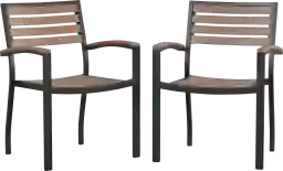Make the most of your patio, deck, or green space with the Renoldor dining chairs. The trending natural brown colored synthetic faux teak slats on the back, seat, and arms contrast beautifully with the black metal frame and blend seamlessly in almost any decor. Entertain guests at your home without worrying about your seating. The 12 gauge aluminum frame features welded construction that holds up to 300 lbs. static weight capacity to accommodate most users. Powder coating helps resist nicks and scratches, and the chair is weather-resistant for year-round use though care should be taken to protect from prolonged periods of wet weather. These outdoor stacking chairs arrive fully assembled and ready to use. Clean your new dining chairs with a damp cloth to maintain their great looks. Fixed glides will maintain the appearance of your hard flooring surfaces when being used indoors. Customer assembly is required.