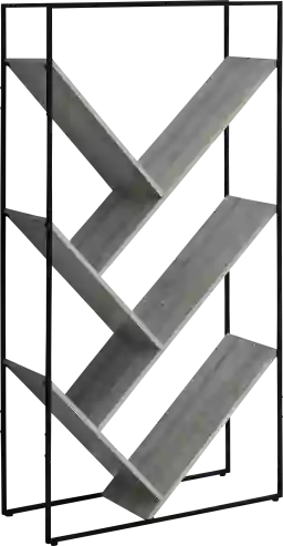 While specific weight limits depend on item distribution, this bookcase is engineered with a sturdy black metal frame that provides robust structural support for the five wood-look shelves. The unique geometric, V-shaped shelf design naturally creates varied storage zones, allowing you to strategically place heavier volumes or decorative objects on the more supported sections of the tiers.