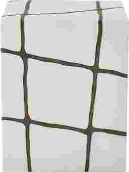 Smooth white Ovina garden stool with a striking bronze finish inlay, crafted entirely from Earthenware clay. May be used outdoors, but protection from freezing temperatures is recommended.
