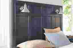 Comforting farmhouse style welcomes a dreamy new expression in the Owings Mill bed's update of classic Americana with nostalgic undertones. The headboard and footboard of this piece showcase an intricate wainscoting design in a rich graphite gray, framed with raised molding details. On the headboard, a charming pair of silver sconces hold LED reading lights with touch controls. A set of short canted legs add a perfect final touch of poise and charm to this bed.