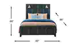 This king bed measures 80 inches wide by 88 inches deep. To ensure a comfortable flow in your bedroom, we recommend a minimum room size of 12' x 12'. This allows for roughly 30 inches of walking clearance on three sides of the bed, providing ample space for nightstands and movement. For rooms with high ceilings, the 68-inch tall headboard serves as an excellent architectural focal point, filling the vertical space effectively.