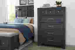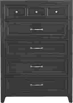 Comforting farmhouse style welcomes a dreamy new expression in the Owings Mill chest's update of classic Americana with nostalgic undertones. This chest offers five spacious drawers framed with raised molding details. Silver metal knobs and bar pull hardware add an enticing touch of contrast to this rich graphite gray piece.