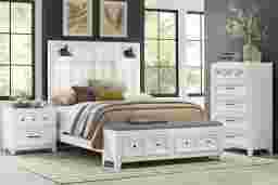 Comforting farmhouse style welcomes a dreamy new expression in the Owings Mill bed's update of classic Americana with nostalgic undertones. The headboard and footboard of this piece showcase an intricate wainscoting design in white, framed with raised molding details. On the headboard, a charming pair of black sconces hold LED reading lights with touch controls. Two spacious drawers with black iron knobs are built into the footboard for extra storage. A set of short canted legs add the perfect final touch of poise and charm to this bed.