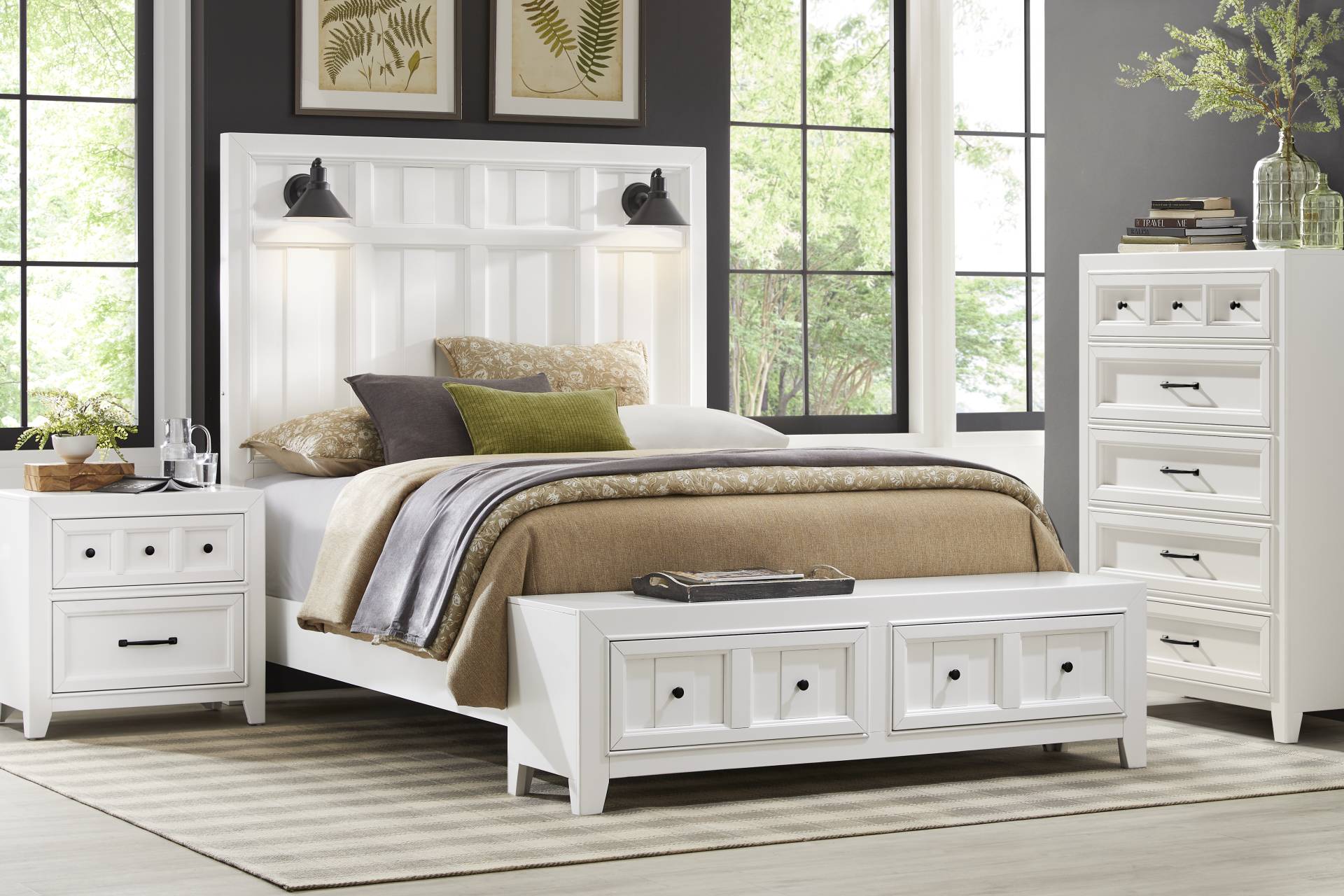 Comforting farmhouse style welcomes a dreamy new expression in the Owings Mill bedroom's update of classic Americana with nostalgic undertones. The headboard and footboard of this set showcase an intricate wainscoting design in white, framed with raised molding details. On the headboard, a charming pair of black sconces hold LED reading lights with touch controls. Two spacious drawers are built into the footboard for extra storage. The nightstand offers USB charging as well as two drawers. Matching the nightstand and footboard, the chest has black iron knobs and bar pull hardware for an enticing touch of contrast. With plenty of storage, this room is ideal for smaller spaces such as apartments and condos.