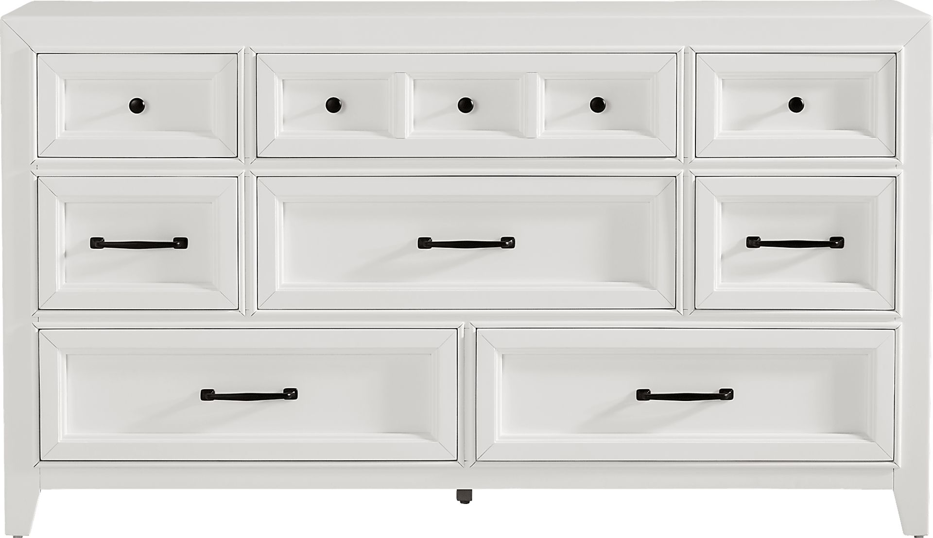 Comforting farmhouse style welcomes a dreamy new expression in the Owings Mill dresser's update of classic Americana with nostalgic undertones. This dresser offers eight spacious drawers framed with raised molding details. Black iron knobs and bar pull hardware add an enticing touch of contrast to this bright white piece.