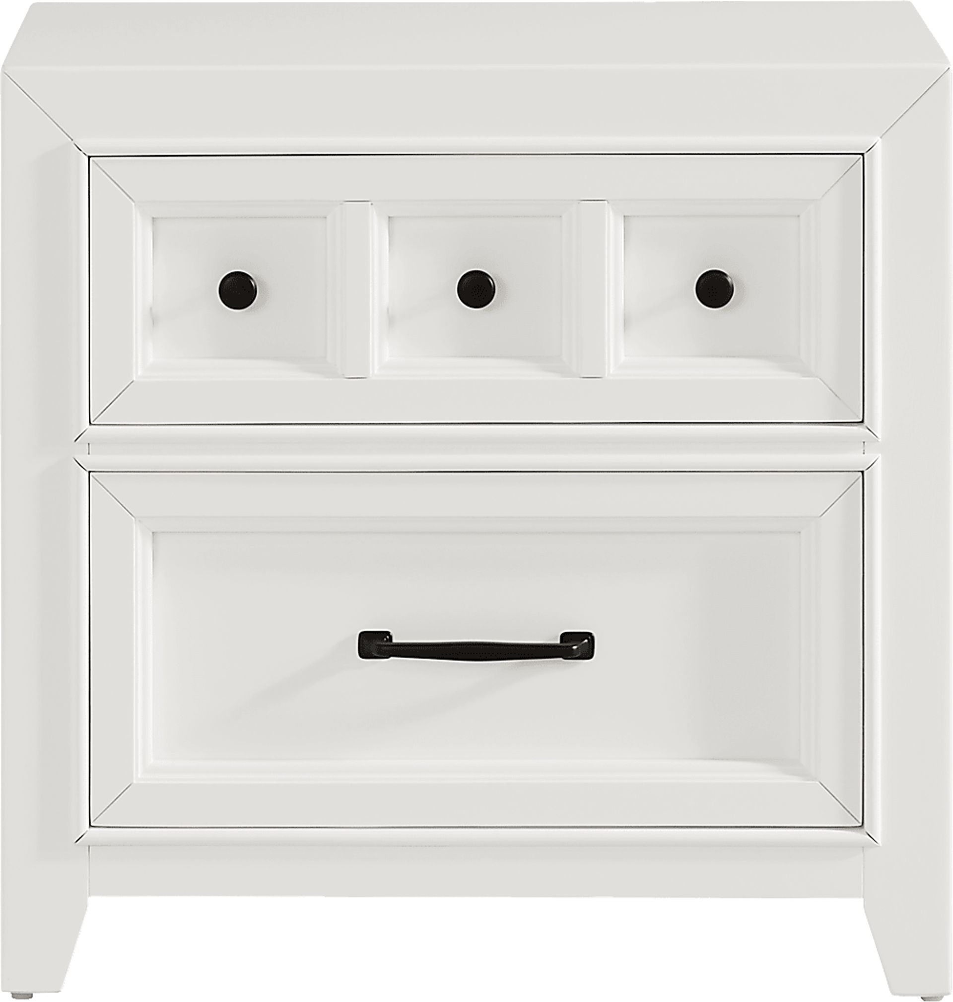 Comforting farmhouse style welcomes a dreamy new expression in the Owings Mill nightstand's update of classic Americana with nostalgic undertones. This piece offers two spacious drawers framed with raised molding details. Black iron knobs and bar pull hardware add an enticing touch of contrast to this bright white piece. Extra convenience is built in, with USB charging available for your devices.