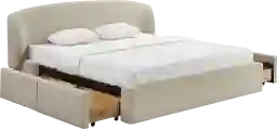 Sustainability gets cozy in the Owlair cream king storage bed, crafted from soft, upcycled linen made of reclaimed plastic bottles. With padded sheltering wings and hidden drawers on smooth-glide casters, it's the definition of chic storage and dreamy comfort. Customer assembly is required.