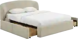 Sustainability gets cozy in the Owlair cream queen storage bed, crafted from soft, upcycled linen made of reclaimed plastic bottles. With padded sheltering wings and hidden drawers on smooth-glide casters, it's the definition of chic storage and dreamy comfort. Customer assembly is required.