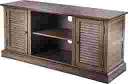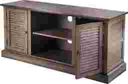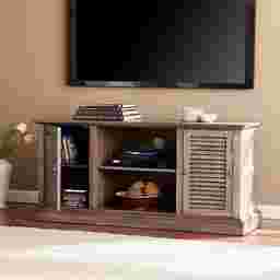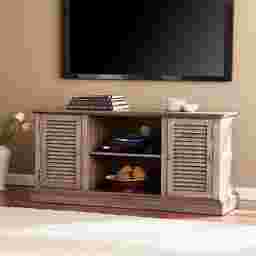 Invite the farmhouse trend into your home with this easy to assemble Oxley media stand. Louvered cabinet doors and soft distressing highlight shabby chic influences; simple, classic shape and elegant burnt oak hue transition this anywhere console into any decor theme. Ample storage, both open and closed, waits for everything from media equipment to extra blankets. Soft country charm comes to life with this storage sideboard acting as an entertainment center in the living room, low profile buffet in the dining room, or walk-by linen closet in the hall. Wood grain and distressing will vary. Customer assembly required. Customer assembly required.