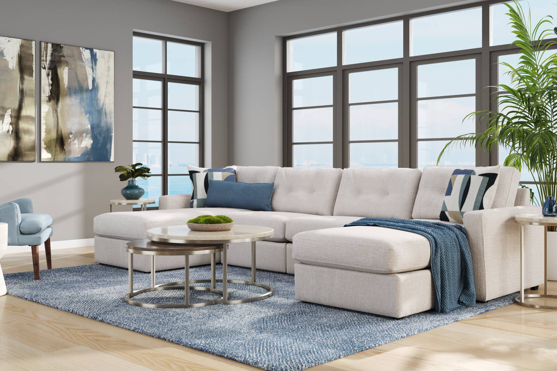 Discover the limitless possibilities of the Drew & Jonathan ModularOne, thoughtfully designed with comfort and flexibility in mind. This customizable seating solution features individual pieces that can be configured to any shape your room needs. Game days, movie nights, sleepovers, and everyday relaxation are all better when the seating arrangement you want is always right at your fingertips. Each individual piece is upholstered on all sides in our signature fabric, Miller. This textured, oyster colored fabric includes Repreve yarn, made with recycled plastic bottles. The seating area has welted track arms, top-stitched seat cushions and button-tufted back cushions for an elegant silhouette. Includes LAF chaise, two armless chairs and RAF chaise. Visit a showroom to learn more about individual components and to work with a sales specialist to customize your own configuration today.