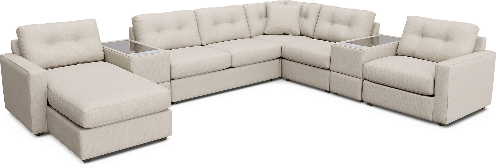 Discover the limitless possibilities of the Drew & Jonathan ModularOne, thoughtfully designed with comfort and flexibility in mind. This customizable seating solution features individual pieces that can be reconfigured to the shape you need for game days, sleepovers, or just everyday relaxation. Each piece is upholstered on all sides in our signature fabric, Miller. This textured, oyster chenille includes Repreve yarn, made with recycled plastic bottles. The collection boasts welted track arms, top-stitched seat cushions and tufted back cushions for an elegant silhouette. Two media consoles offer storage, USB ports and wireless charging, Bluetooth speakers, and double as side tables with acrylic tops. A Sealy Royale mattress is tucked inside the armless loveseat for guests who would like to extend their stay. Includes LAF chaise, RAF seat, two media consoles, wedge seat, armless chair, and loveseat. Upholstery: 100% Polyester.