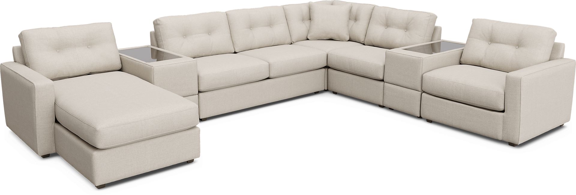 Discover the limitless possibilities of the Drew & Jonathan ModularOne, thoughtfully designed with comfort and flexibility in mind. This customizable seating solution features individual pieces that can be reconfigured to the shape you need for game days, sleepovers, or just everyday relaxation. Each piece is upholstered on all sides in our signature fabric, Miller. This textured, oyster chenille includes Repreve yarn, made with recycled plastic bottles. The collection boasts welted track arms, top-stitched seat cushions and tufted back cushions for an elegant silhouette. Two center consoles provide hidden storage and double as side tables with sleek acrylic tops. A Sealy Royale mattress is tucked inside the armless loveseat for guests who would like to extend their stay. Includes LAF chaise, RAF seat, two consoles, wedge seat, armless chair, and loveseat. Upholstery: 100% Polyester.